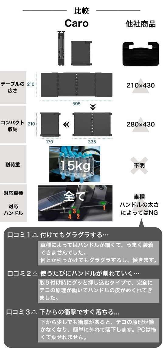 他社の「ハンドルに板を引っかけるタイプ」の車内テーブルは、ハンドルの太さによっては安定しない、テコの原理でハンドルが痛む、下からの衝撃ですぐ外れてしまうといったデメリットがありましたが、Caroはこの特殊構造で全て解消。