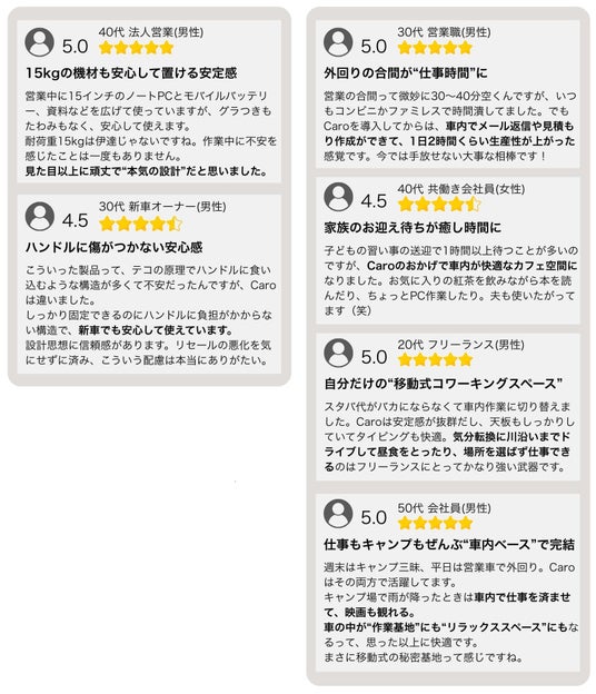車の「快適チェア」、「完全個室」、「移動可能」という特性も踏まえると、車内をカフェより快適な「最強の書斎」に変えるこれまでにないギアです。
