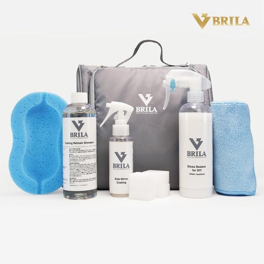 BRILAプレミアムカーケアセットリフレッシュシャンプー(300ml)、グロスシーラント撥水(300ml)、サイドミラーコーティング(100ml)、洗車用スポンジ、シーラント用クロスを専用バッグにまとめた施工店クオリティのスターターキット。