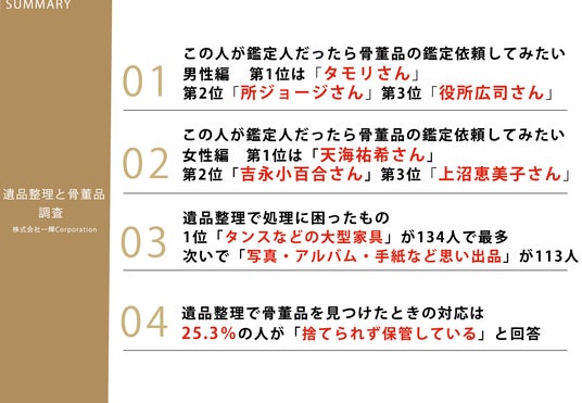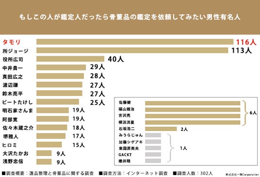 今回は、遺品整理を経験した30代から60代の男女302名を対象に、この人が鑑定人だったら骨董品の鑑定を依頼してみたい有名人ランキング調査を実施しました。