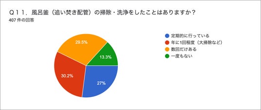 しかし一方で、風呂釜(追い焚き配管)まで掃除している人は少なく、「年に1回程度(大掃除など)」が30.2%、「一度もしたことがない」が13.3%と、見えない部分が後回しになっている実態が明らかになりました。