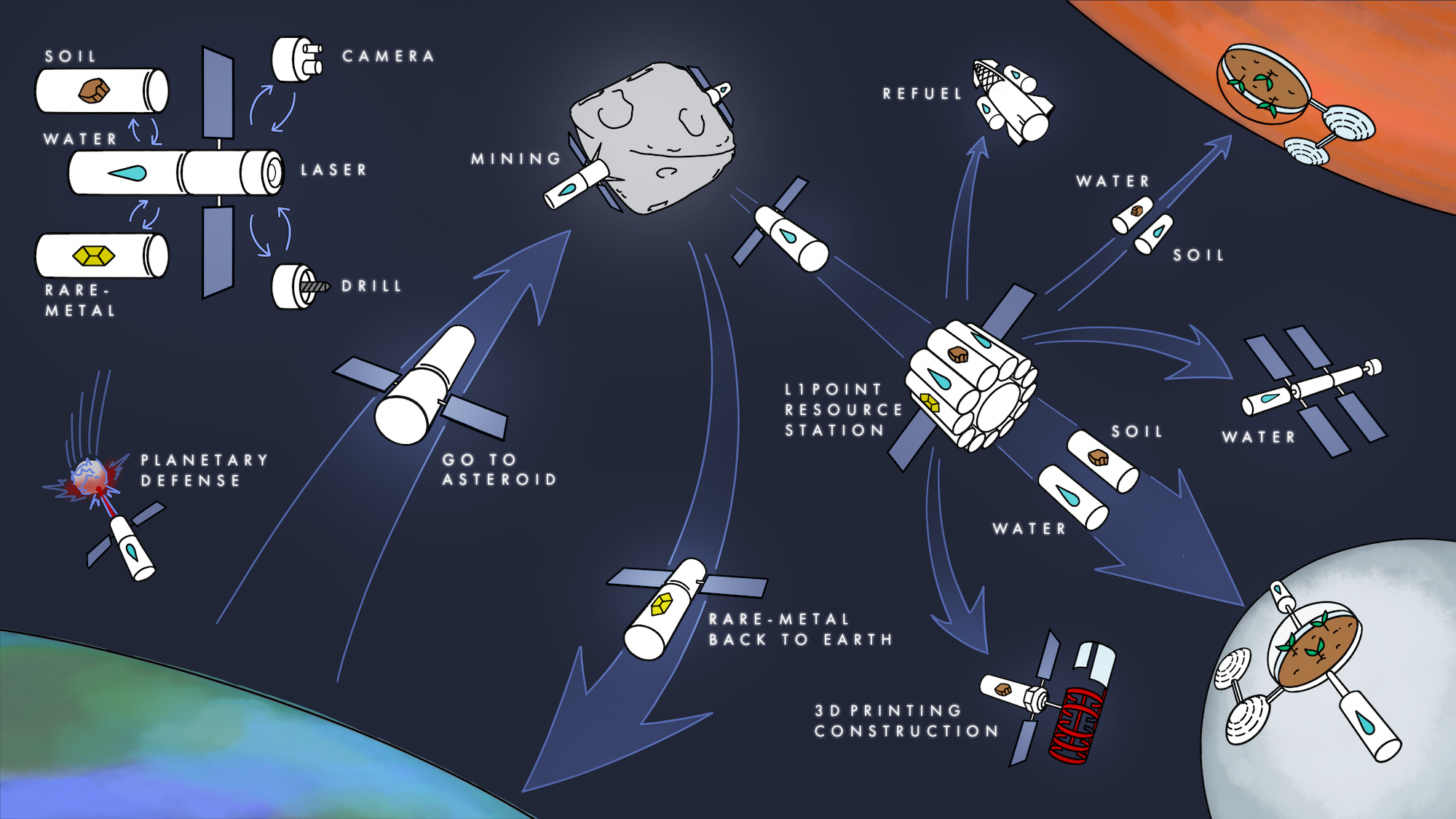 当社は、民間の立場から小惑星資源の探査・輸送インフラの構築に取り組み、宇宙空間での資源活用を実現するロジスティクス(輸送・供給)分野を担います。