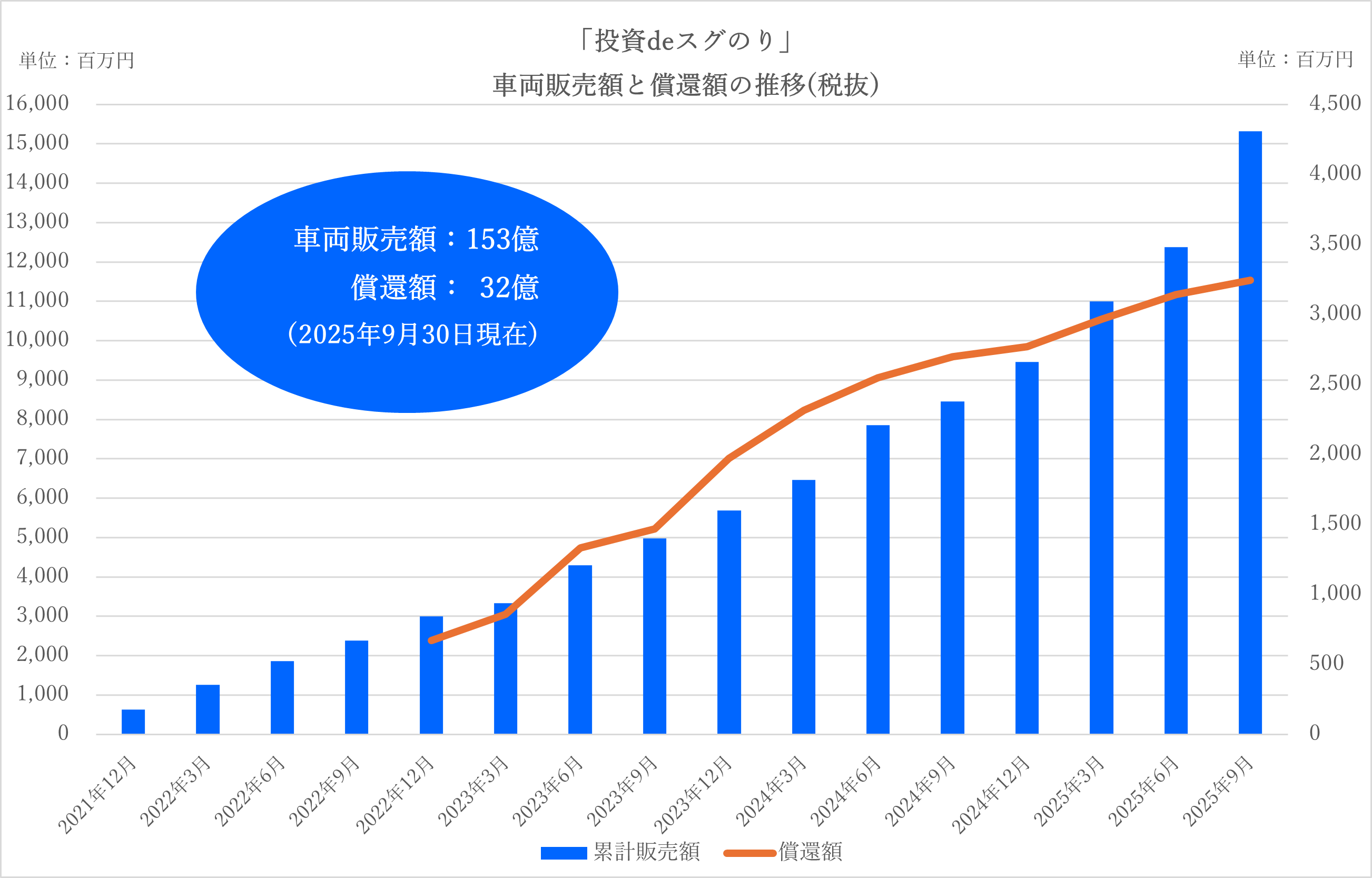 また、トラックを投資対象としたオペレーティングリース商品「投資deスグのり」の累計販売額が、2021年11月の販売開始から3年11か月で153億円に達し、累計償還額は32億円となったことをお知らせいたします。(2025年9月30日 現在)