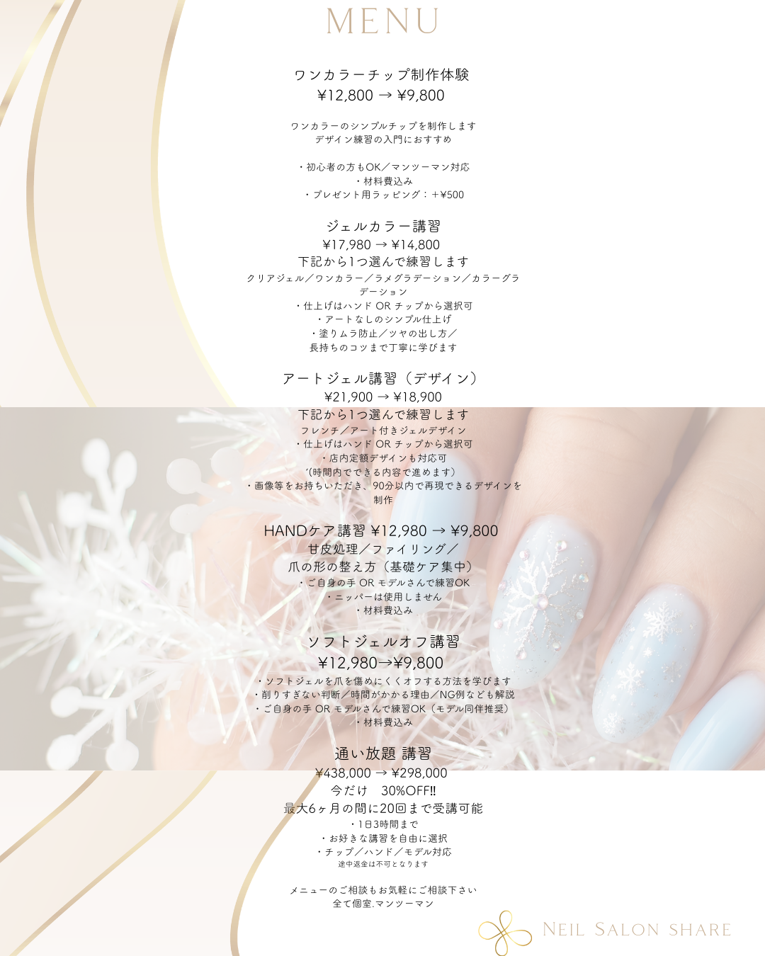 ■レッスンprice■すべてのレッスンは完全個室マンツーマン対応・材料費込みです。今だけ初回限定割引!!