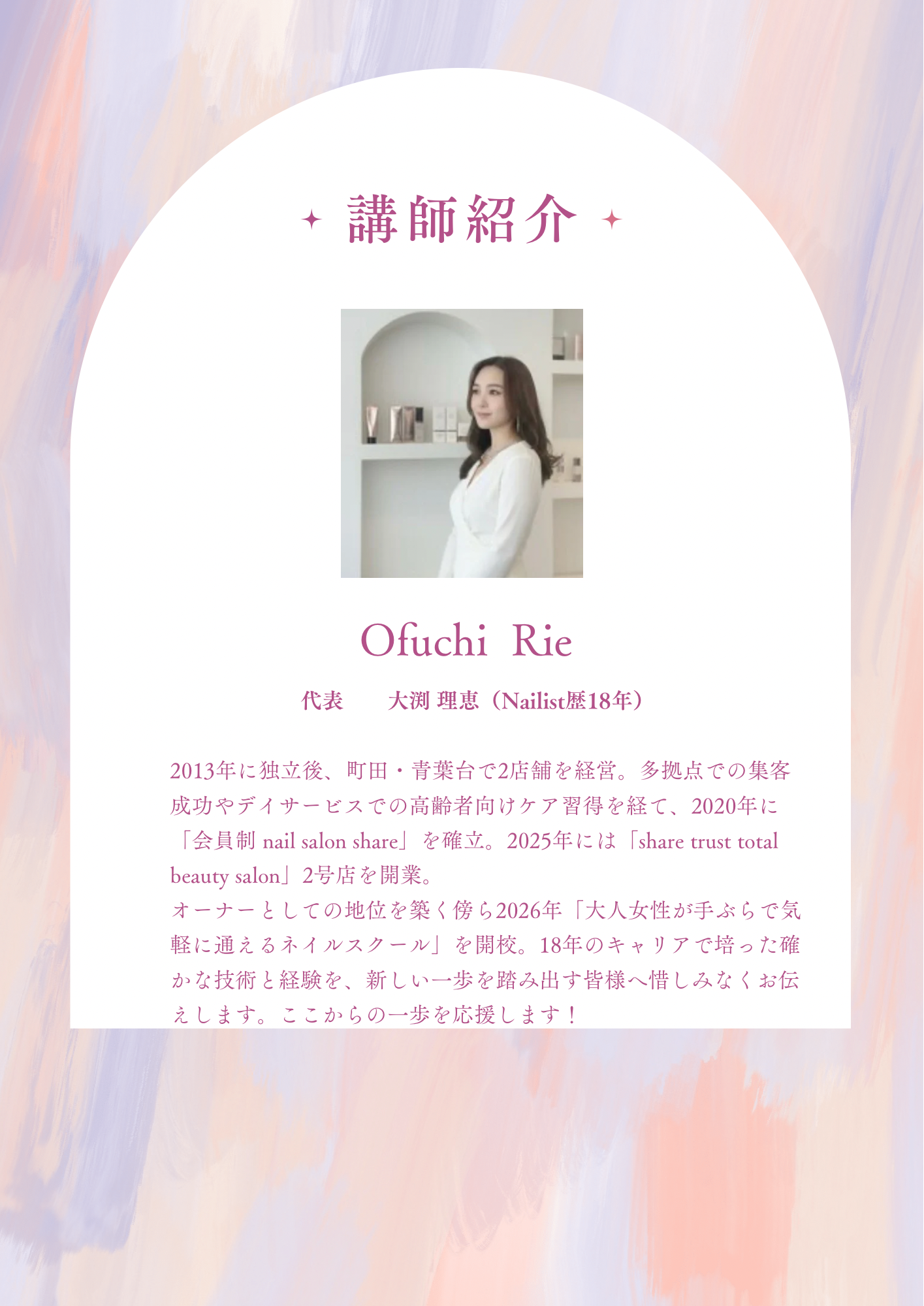 スクールへの想い大人になって、仕事や子育てに追われる日々の中で、「本当はやってみたかったこと」ありませんか?子育てや仕事が少し落ち着き.振り返ってみたら、「あ、、ネイル習って見たかったな」でも…「今さら遅いかも」「若い子に混じって習うには今更、勇気がいる」....。そう思っている方にこそ、お伝えしたいことがあります。私自身、サラリーマンからの遅咲きネイリスト人生のスタートでした。100円ショップのチップとマニキュア購入し、見よう見まねで作ることから始まり、初めて訪れたネイルサロンの煌びやかな世界と、その高額な価格に衝撃を受けたことを今でも覚えています。何ものでも無い私が何になれるのだろう。。サラリーマンでは終わりたく無い。そうか、ネイルなら私にも出来るかもしれない。そこから始まったネイリストへの道でした。