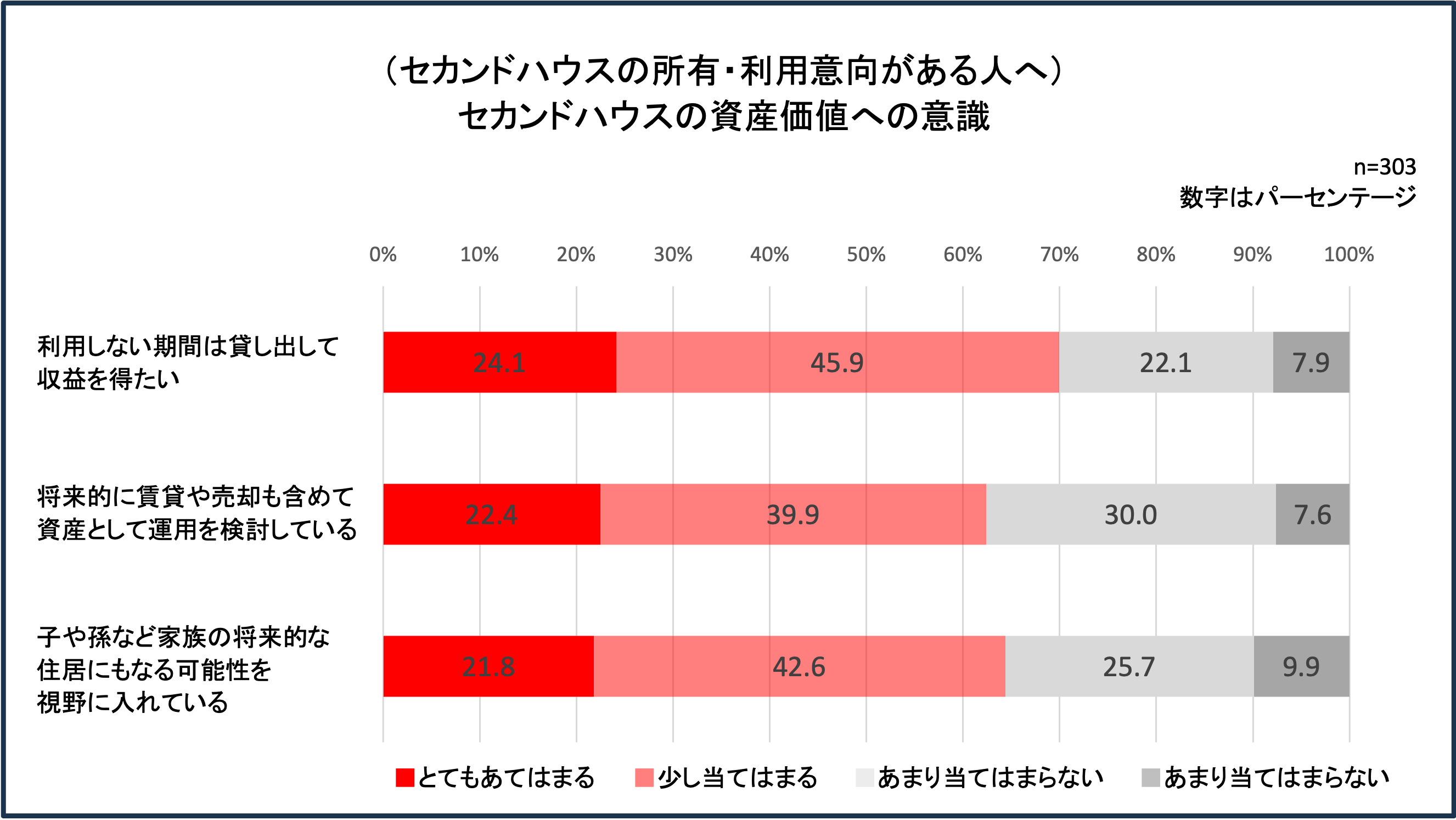 セカンドハウスの資産価値についての考え方を聞くと、「セカンドハウスに資産価値を期待している」に「当てはまる」(「とても当てはまる」+「少し当てはまる」)と答えた人が、69.6%に上りました。物価高や不透明な経済環境に加え、民泊など運用手段の多様化が影響していると推測できます。