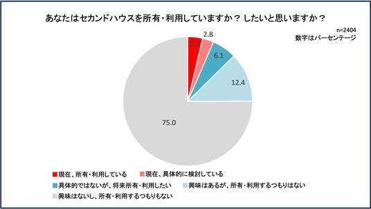 「あなたはセカンドハウス(別荘や二拠点住宅)を所有・利用していますか? したいと思いますか?」との設問を投げかけたところ、3.7%がユーザー層(現在、所有・利用していると回答)であることがわかりました。2.8%の検討層(具体的に所有・利用を検討している)、6.1%の関心層(具体的ではないが、将来所有・利用したい)も含めると、現時点で12.6%が、セカンドハウスを所有・利用する可能性がります。