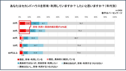 ユーザー層+検討層は20代で11.4%、30代で10.4%と、他の年代を大きく引き離しました(40、50、60代とも4%以下)。若い世代の10人に1人が、現実的な選択肢としてセカンドハウスを捉えているのです。