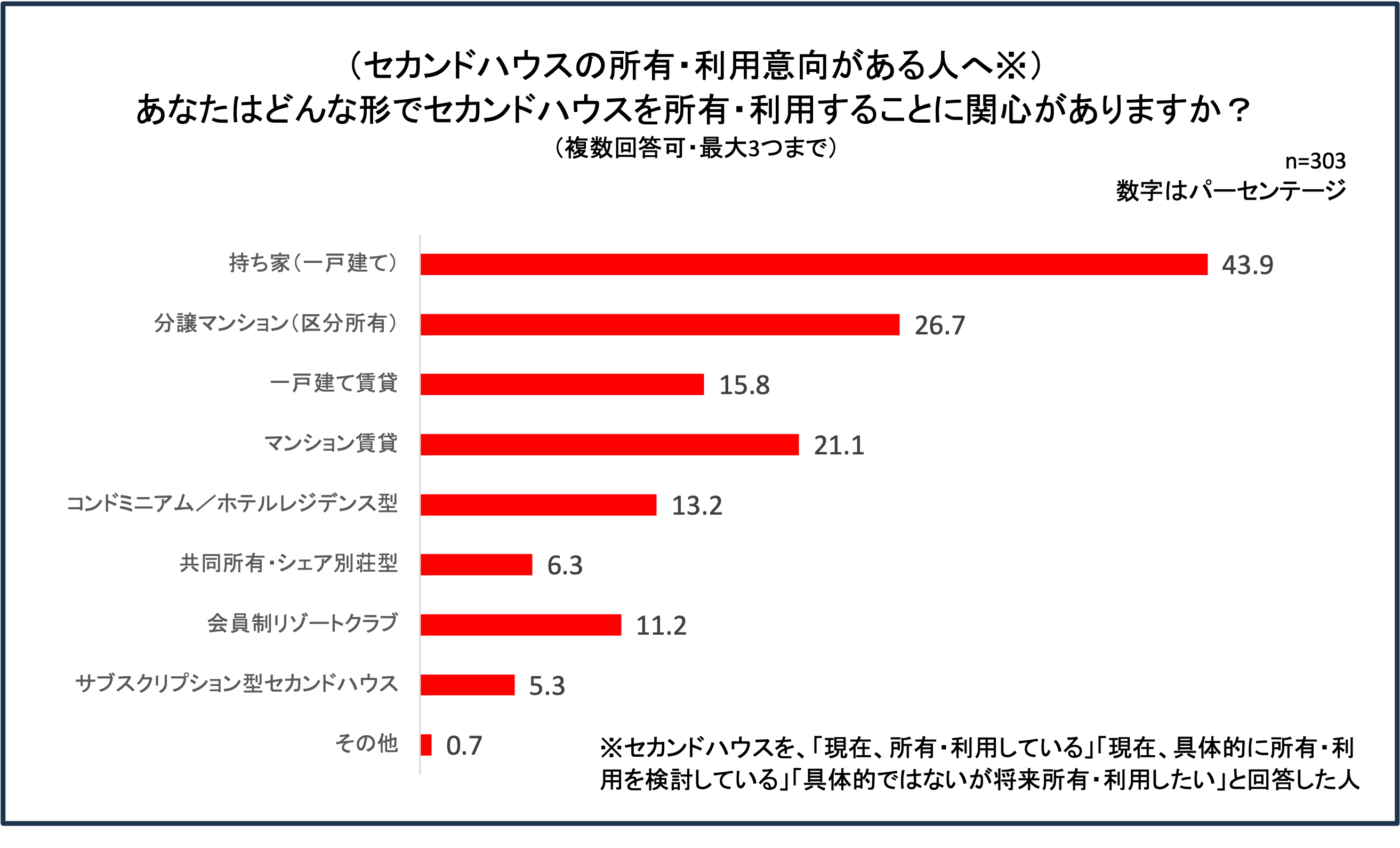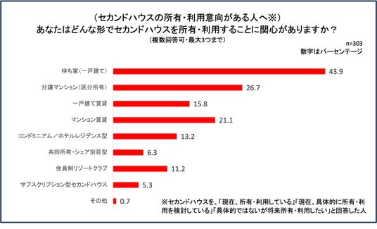 ユーザー層、検討層、関心層(セカンドハウスを「現在、所有・利用している」「具体的に所有・利用を検討している」「具体的ではないが、将来所有・利用したい」と回答した人)の303名に、興味のある物件を聞いたところ(複数回答可、最大3つ)、最も多かったのは「持ち家(戸建て)」の43.9%。続いて「分譲マンション(区分所有)」の26.7%が続き、賃貸やサブスクリプションなどの「利用」より、物件「所有」の意向が高いことがわかりました。