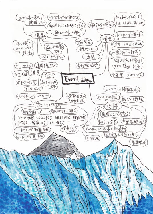 40歳の写真家が、なぜエベレストを目指したのか。 本書は、2024年5月にエベレスト登頂を果たした関健作が、「登る」と決意した日から山頂アタックまでの4ヶ月間、溢れ出る感情とイメージを毎日ノートに綴った「絵日記」をまとめたものです。 資金集め、日々のトレーニング、家族への思い、準備を尽くしても消えない不安、現場での予期せぬトラブル。それでも見たい未知の景色。 毎日エベレストを描き続けることで、次第に浮かび上がってきたのは、自身の内面にそびえる山「マインド・エベレスト」
