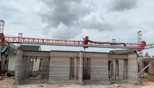 建築途中の様子。独自開発の3Dプリンターが自動で壁面を積層していく施工風景