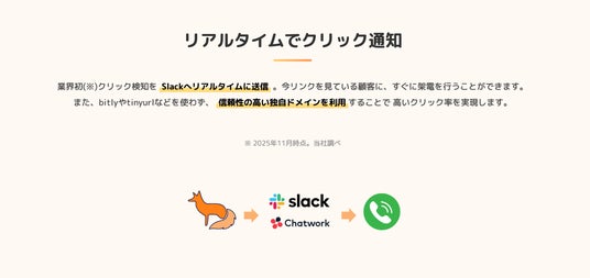 短縮URL特有の「怪しさ」を独自ドメインで排除し、到達率・クリック率を向上。顧客の関心が最高潮に達した「その瞬間」の架電を実現し、商談化率を最大化します。