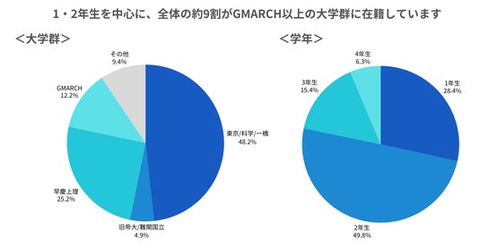 ○5割を超える難関国公立大学(東京大学、東京科学大学、一橋大学等)生、約8割の早慶上智生、約9割のGMARCH以上とする上位校の学生が中心となっています。学年構成は、1・2年生が約7割登録しています。