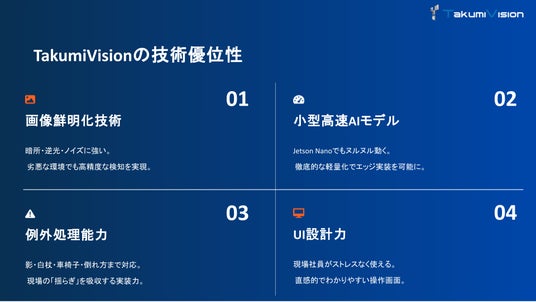 TakumiVisionの画像認識AIは、独自の軽量アルゴリズムを採用していることが特徴です。