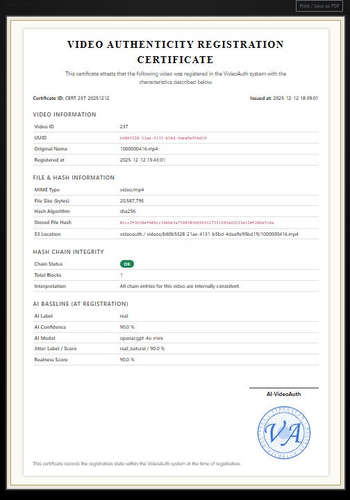 「AI-GENERATED VIDEO IDENTIFICATION AND HASH-CHAIN BASED AUTHENTICITY PROOF SYSTEM」