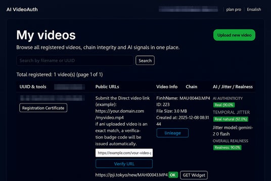 動画の真正性を数学的に証明する特許技術「AI-VideoAuth(TM)」を正式公開しました。