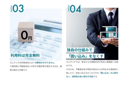 「スムマッチ」は、従来の不動産売却にありがちな、しつこい営業電話や面倒な対面手続きをなくし、売主が自分のペースで取引を進められる、新しい不動産マッチングサービスです。