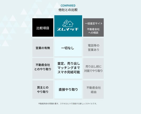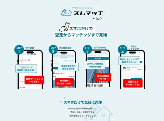 「スムマッチ」はスマホで気軽に売り出せる、新しい不動産売却サービスです。物件の売却活動における価格査定、媒介契約、買主探しがスマホで完結※、直接 買主から買いたい価格が届きます。