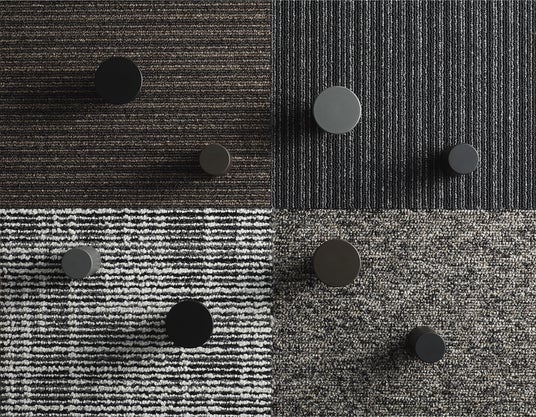 石材・スレート・コンクリートなどのモノトーン系床材なら〈チャコールグレー〉。タイルカーペットや塩ビタイルともよく調和する、わずかにあたたかみのある、くせのないダークグレーです。