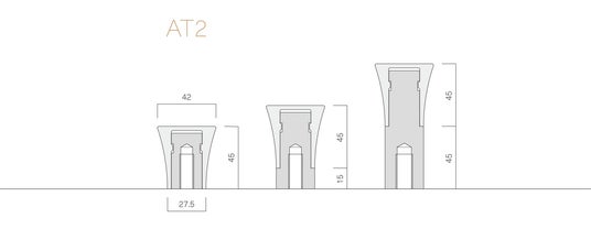APLUS AT は現代の建築空間になじむミニマルデザインの戸当りです。くせのないシンプルなデザインなので、ホテル・劇場・施設・店舗から住宅・マンションまで、シーンを選ばず幅広く使えます。プロポーション重視の細身のフォルムは、こだわりの「Φ27.5」。リップスティックのような〈AT1|ミニマル〉と、従来の「きのこ型」を洗練させた〈AT2|トーチ〉の2タイプから選べます。
