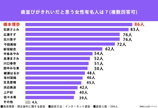 ・歯並びがきれいだと思う女性有名人ランキング第1位「橋本環奈さん」(86人)、第2位「石原さとみさん」(83人)、第3位「広瀬すずさん」「北川景子さん」(76人)