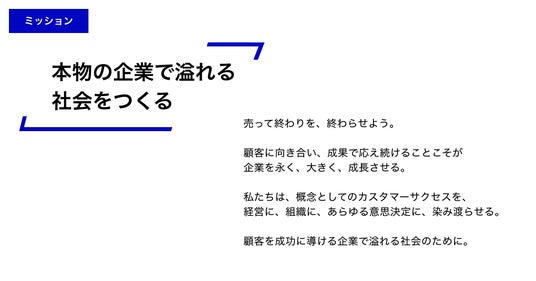 私たちは、顧客に向き合い、成果で応え続けるカスタマーサクセスを実践する企業を「本物の企業」と表現し、「本物の企業で溢れる社会をつくる」をミッションとしてカスタマーサクセス株式会社を設立いたしました。直球勝負のこの社名には、日本におけるカスタマーサクセスの正しい普及と社会実装を私たちが担っていくという覚悟を込めています。