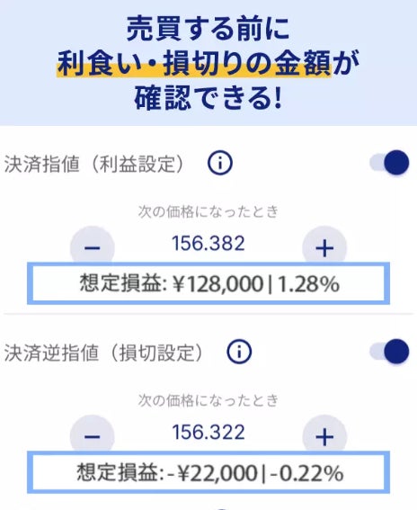 発注前に目標とする想定利益価格や、相場が想定と反対方向に動いた場合の想定損失価格を事前に確認可能。取引条件を把握したうえで、安心して判断できる設計です。