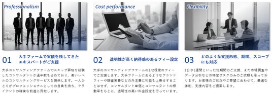 大手コンサルティングファーム出身のエキスパートによる高品質な支援を、透明性の高いフィー設定で、必要な期間・スコープに応じて柔軟に提供します。