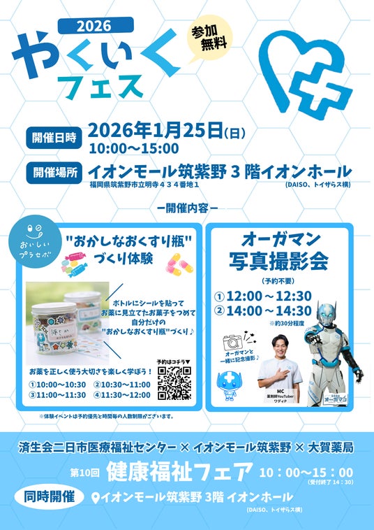 福岡県済生会二日市医療福祉センター(福岡県筑紫野市)は、イオンモール筑紫野、株式会社大賀薬局と共同で食と健康をテーマに地域住民の健康づくりを支援するイベント「健康福祉フェア」を1/25(日)イオンモール筑紫野にて開催します。
