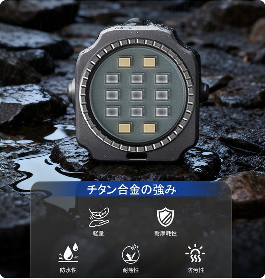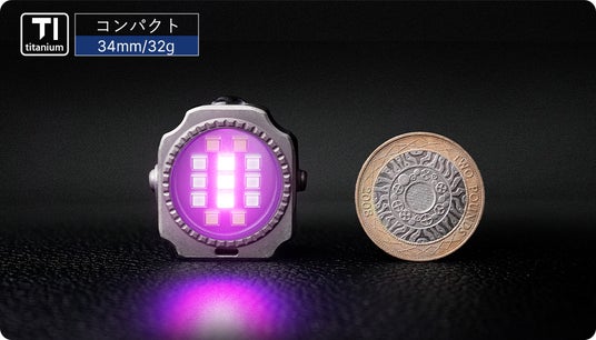 コインサイズのチタン合金ボディに最大300ルーメンの明るさ、5種類のLEDカラーと多彩な照明モードを搭載し、強力マグネット内蔵の角度調節可能スタンドでハンズフリー照明も可能です。