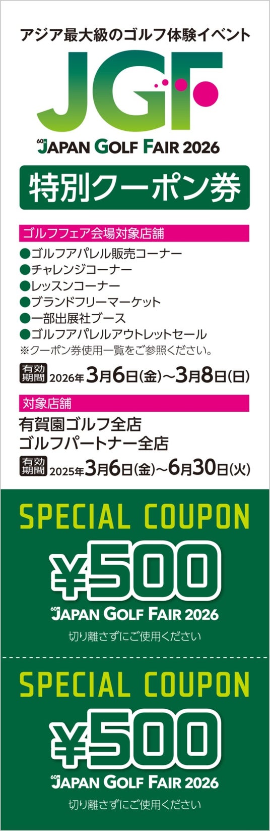 一般社団法人日本ゴルフ用品協会(略称:JGGA 会長:倉島隆夫)は、2026年3月6日(金)~8日(日)の3日間、パシフィコ横浜にてアジア最大級のゴルフ体験イベント「JAPAN GOLF FAIR 2026」を開催いたします。ジャパンゴルフフェアの来場者は前回5万人を超え年々増加傾向にあるなか、60周年を迎える本年は出展社数・展示コマ数ともに過去最大規模で前回を超える来場者数を見込んでおります。また、本日1月22日(木)より公式サイトの公開および、前売りチケットの販売を開始しました。さらに、公式Instagramのアカウントからも「JAPAN GOLF FAIR 2026」の最新情報をお届けしていきます。