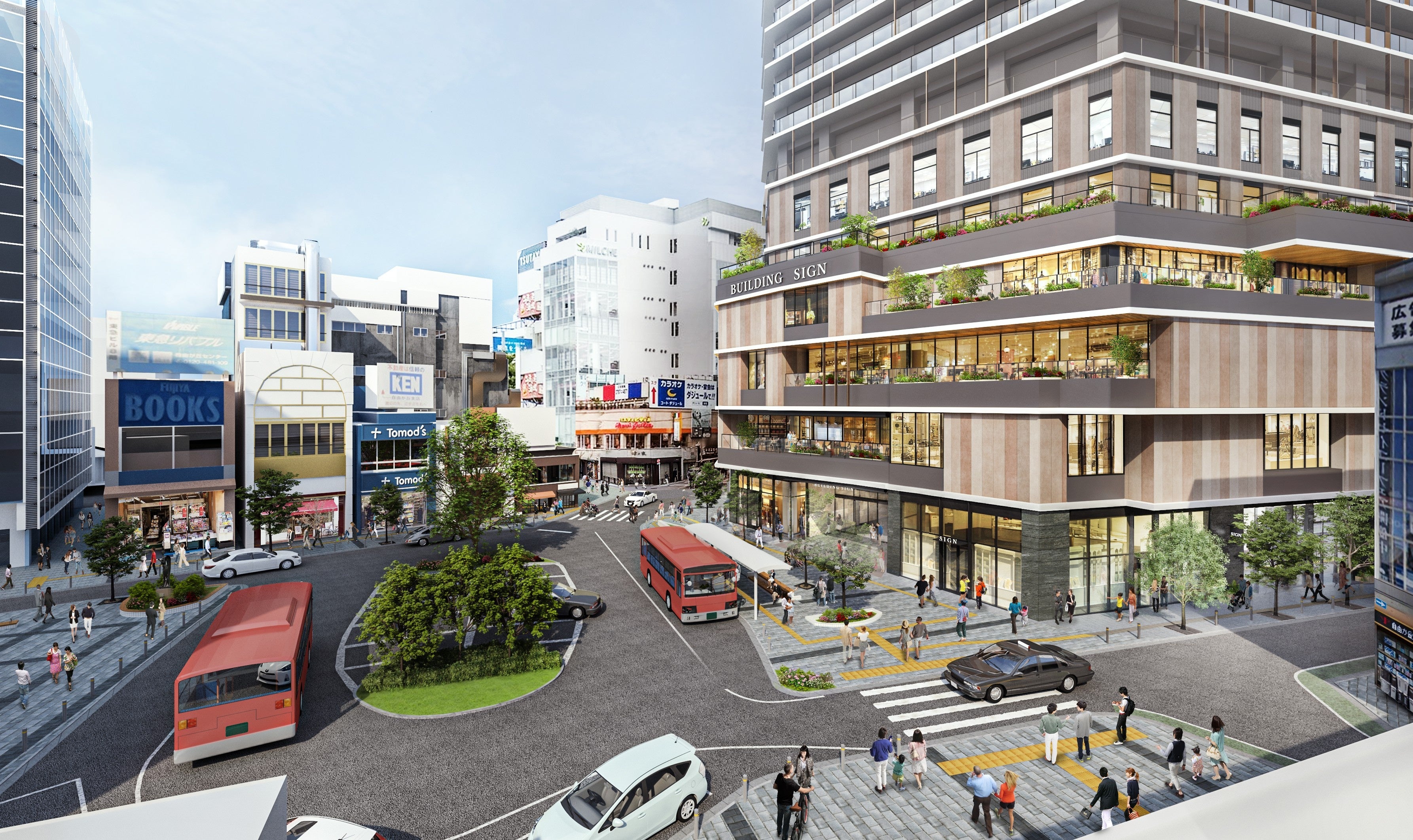 また、駅前を安全かつ快適に回遊でき、賑わいや活力を生み出す新しい拠点として、1階には南北に「貫通通路」を、敷地周囲には歩行者通路、緑ある滞留空間を設けることで、これまでの街歩きがより楽しくなる「自由が丘の新たな街並み」を創出します。
