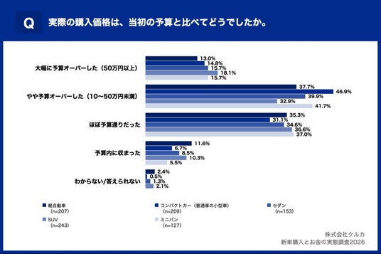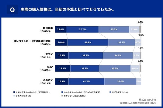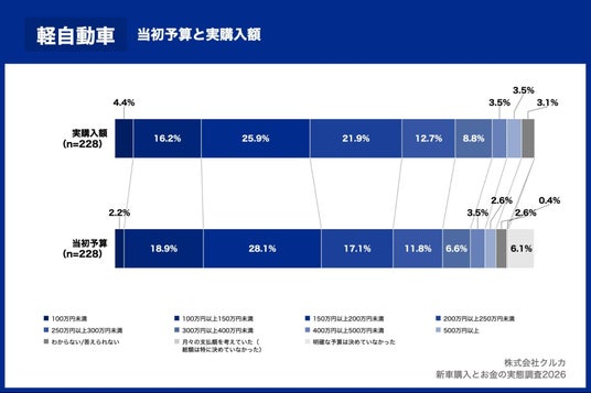 株式会社クルカは、直近3年以内(2022年1月以降)に新車を購入し、購入時の意思決定に関与した方 1,076名を対象に、新車購入とお金の実態調査2026を実施しましたので、お知らせいたします。本リリースでは、車のカテゴリ別に見た「当初予算と実際の購入額のズレ」を分析した結果をお知らせいたします。