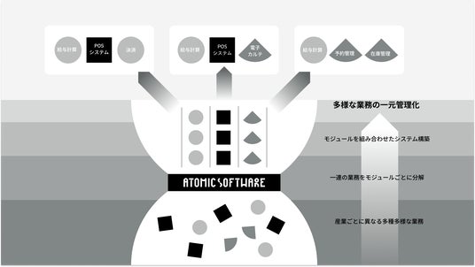 アトミックソフトウェア思想とは、あらゆる物質を構成する最小単位「原子(アトム)」のように、自在に組み合わせ可能な単位で機能を設計してモジュール化し、そのモジュールの組み合わせにより産業ごとに最適化されたソフトウェアを提供していく考えを指しています。産業ごとに異なる課題へ深く向き合いながらもスピードをもって事業に取り組んでいます。