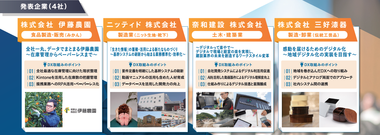 今年度プログラムに参加した4社が、DX推進の取組内容や成果を発表します。