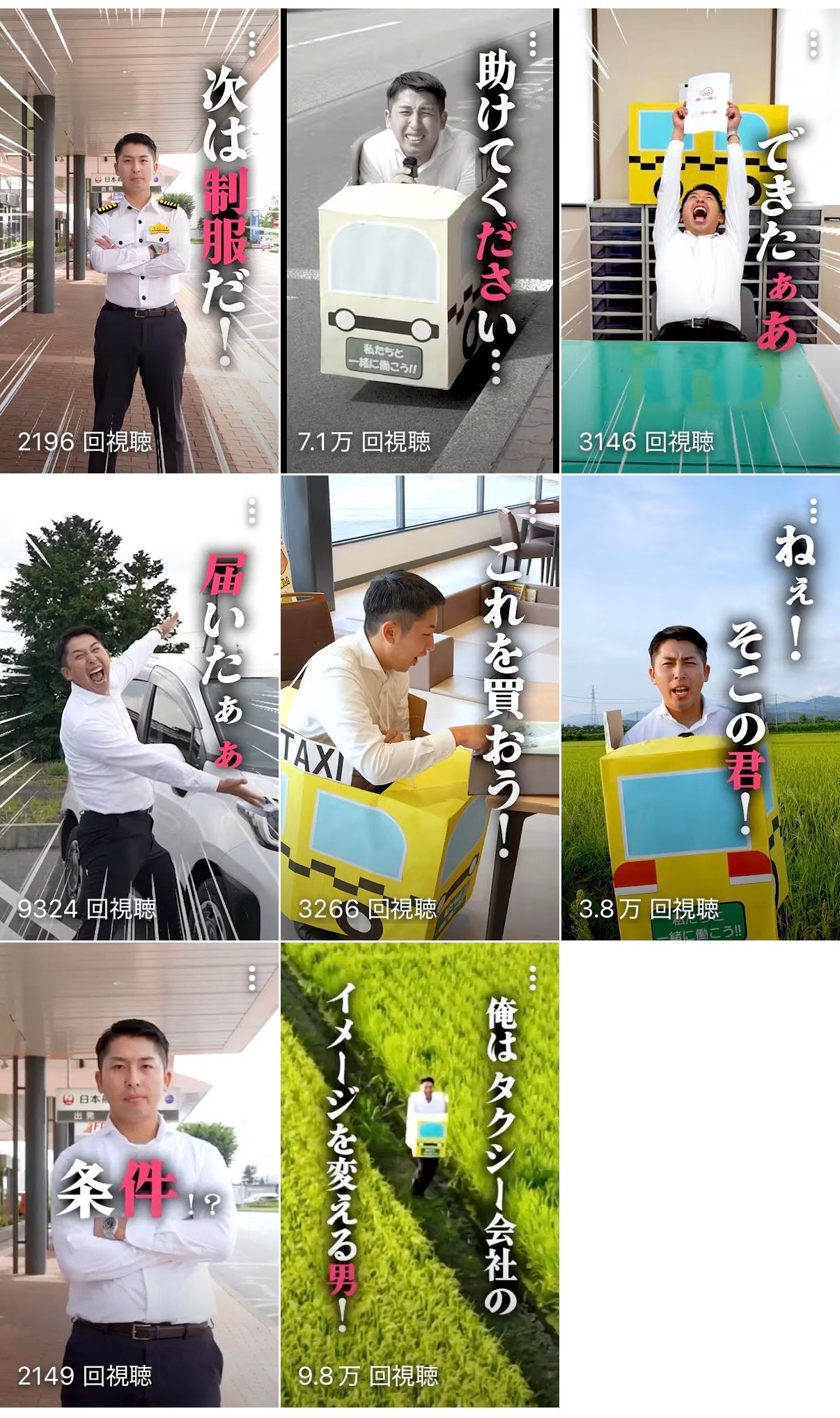 1. あえて"ふざける"ことで、ハードルを下げる :「タクシー会社=お堅い」という固定概念を逆手に取り、社長自らが手作りの「段ボールタクシー」を被って走るというユニークなショート動画を計8本制作。Youtube、Instagram等で配信しました。 一見ふざけているように見えますが、これは「未経験でも飛び込める明るい社風」や「社長との距離の近さ」を、言語化せずに直感的に伝えるための緻密な戦略です。