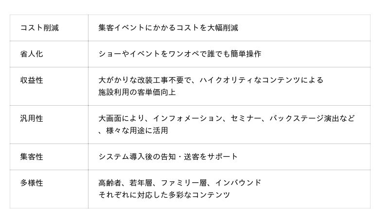 インバウンドやコロナ禍のリバウンドで活性化する全国の宿泊施設。その一方で、サービスの質を高め満足度を向上させるための差別化が求められている。一般的に収益UPに必要な「サービスの向上と省人化」はトレードオフとされているが、「ミューラルライブ」は、映像音響技術を駆使し、高品質のサービスを最小限の固定費で提供できるシステム。実際に演者はそこにいないが、独自技術による映像表現、演出、照明、音響効果によって、まるで本人がその場に存在するような臨場感のあるライブステージを低コストで実現する。