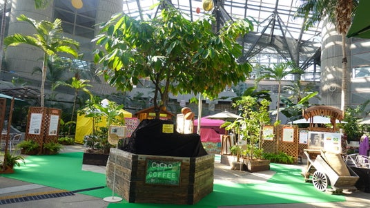 大きなホールにカカオやコーヒーノキを展示。カフェテーブルも多数ご用意しています。ゆったり植物を観察しながら楽しむことができます。
