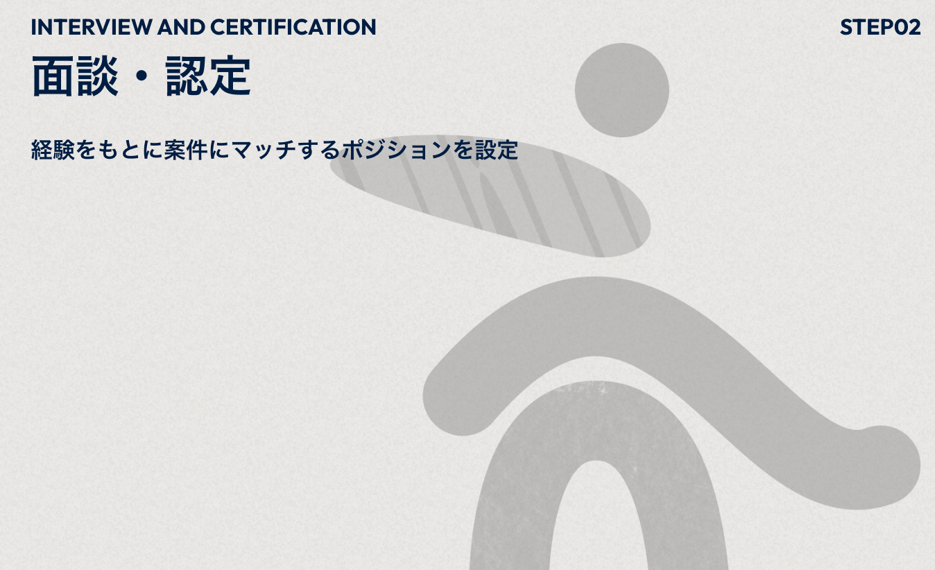 登録時の面談と審査でスキルや経験を可視化。得意領域を活かせる案件を紹介され、キャリア成長にもつながります。