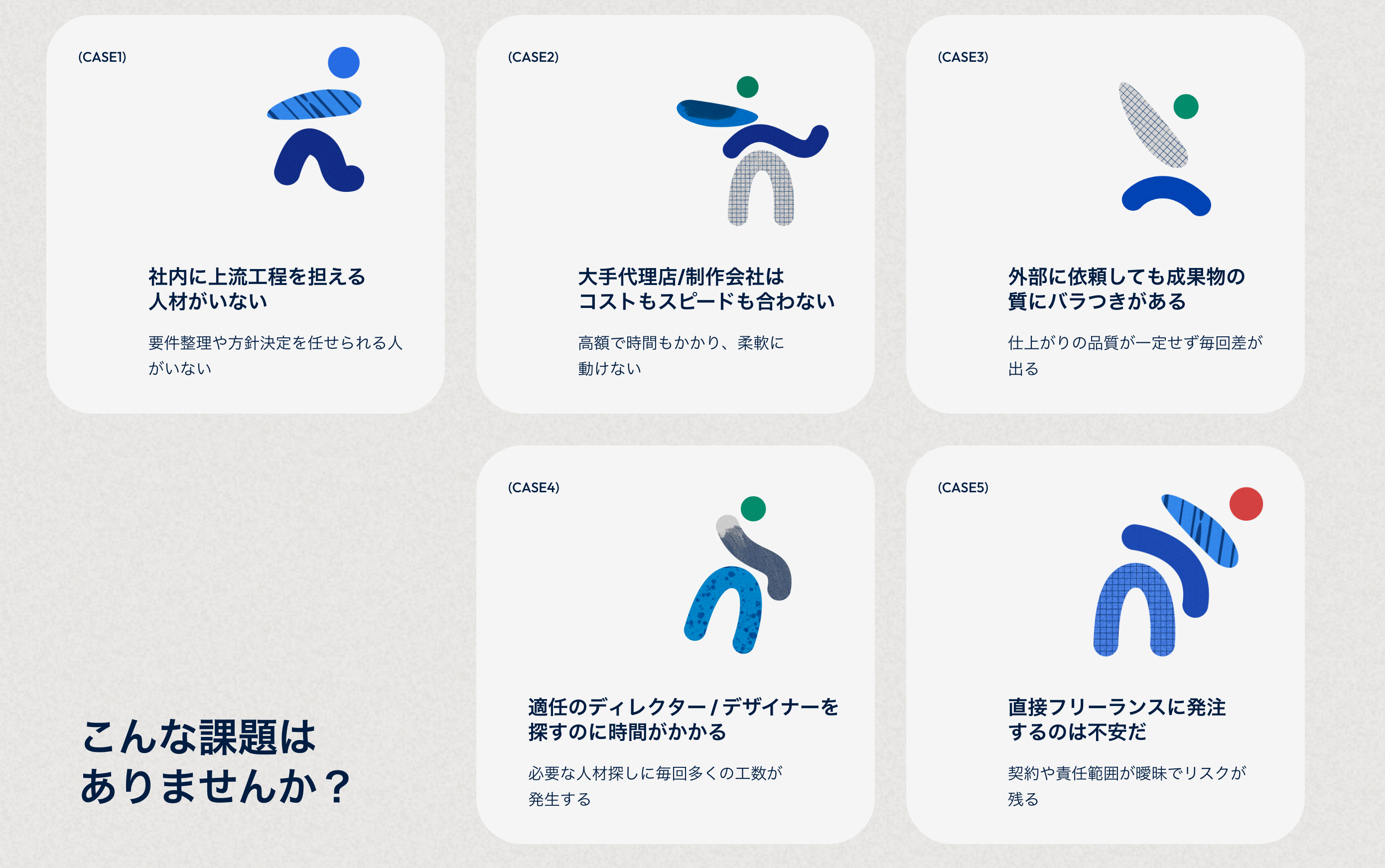 提供内容:広告クリエイティブ領域において、ディレクションおよびプロジェクトマネジメントを代替する人材・体制を提供するサービス。 企画はあるが進まない、判断が遅れ手戻りが多い、成果の再現性が持てない。 そうした現場に入り、意思決定と進行を担い、プロジェクトを前に進め続けます。