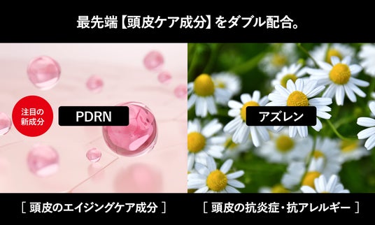 HATUが欠かせない性能として製品に盛り込んだのは頭皮ケア(スカルプケア)。世界的に流行しつつあるエイジングケア成分『PDRN』をヘアケア製品に採用。頭皮の若々しさをサポートします。それに加え、抗炎症成分である『アズレン』を配合。紫外線やカラー・パーマ等による頭皮へのダメージをケアします。