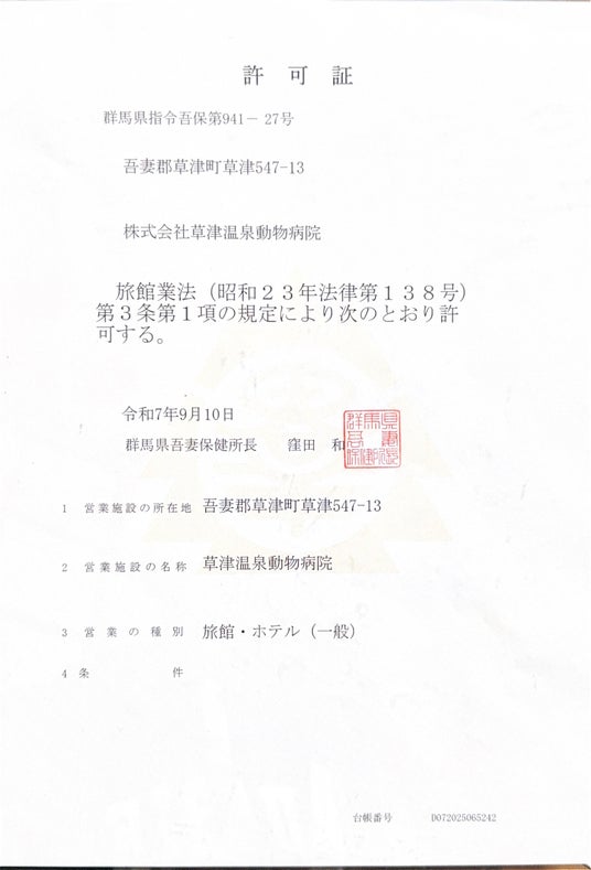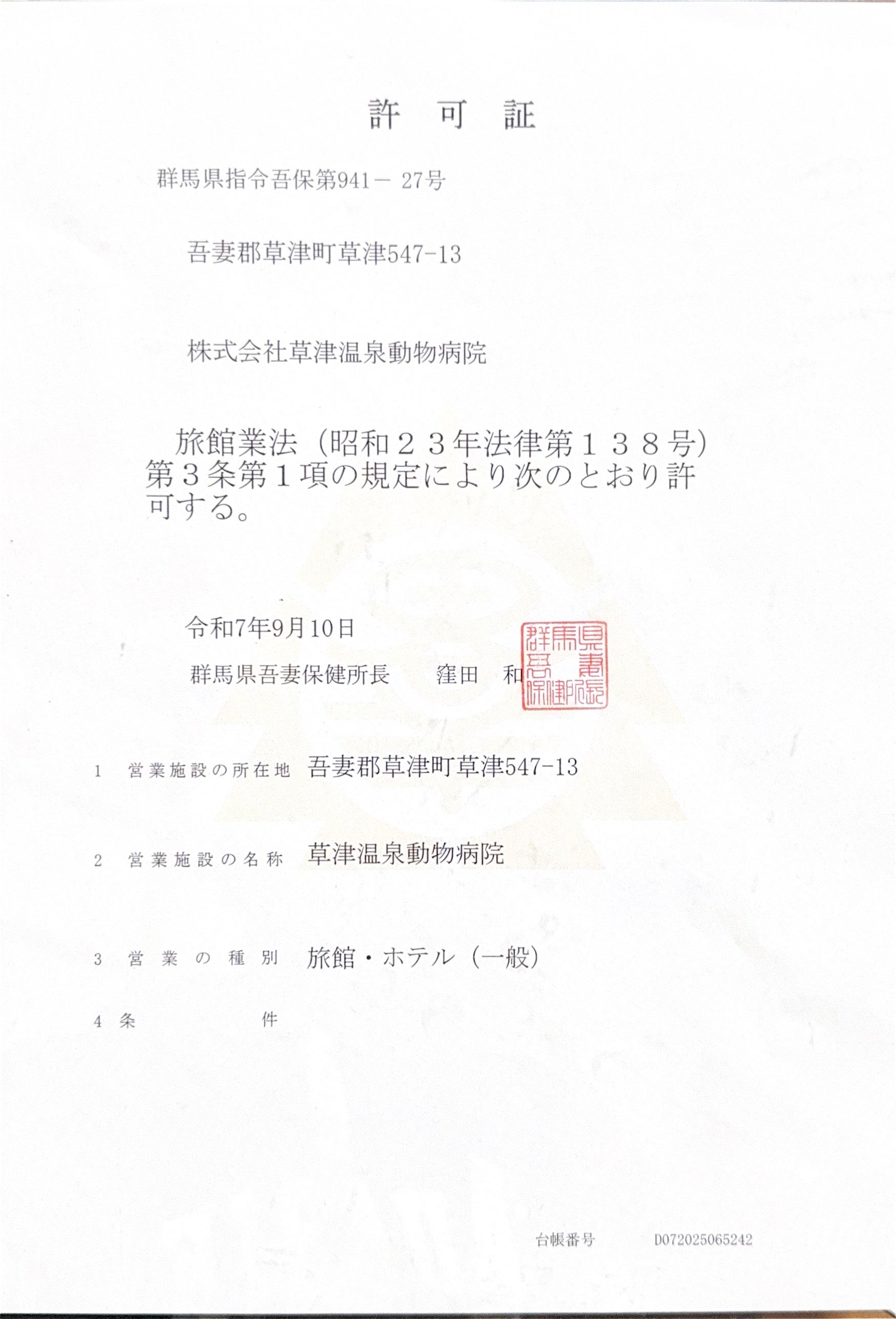 【定義】 「獣医師法(動物診療施設)」「温泉法(源泉利用)」「旅館業法(宿泊)」「動物愛護管理法(動物保管)」の4つの許認可を全て取得し、草津温泉の源泉100%掛け流しを利用したケアと、飼い主同伴の宿泊滞在をワンストップで提供する施設。