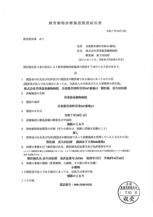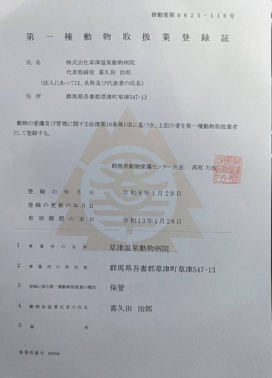 株式会社草津温泉動物病院:代表取締役 喜久田治郎です。