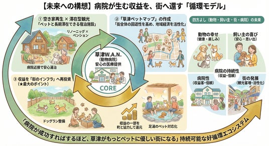 収益を「温泉街のインフラ」へ再投資事業で得た収益の一部を町と協力して「ペット対応化整備」などに充てていきます。「動物病院が成功すればするほど、草津がもっとペットに優しい街になる」。そんな四方よし(動物・飼い主・街・病院)の未来を作ります。
