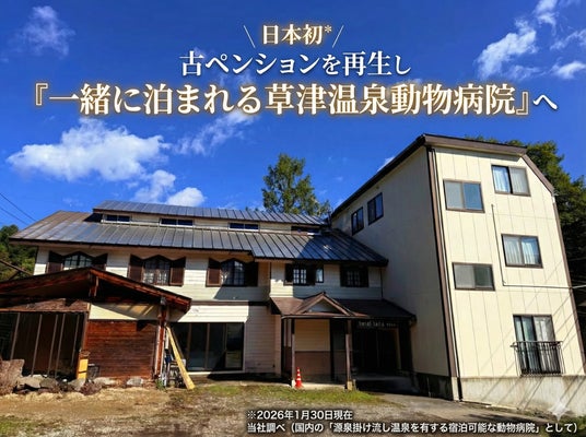 ※「日本初」の表記について 2026年1月30日現在 自社調べ。 日本国内における「獣医師法(動物診療施設)、温泉法(温泉利用)、旅館業法(宿泊)、動物愛護管理法(保管)の4つの許認可・届出を全て有し、源泉100%掛け流し温泉でのケアと宿泊を同時に提供する動物病院」として。