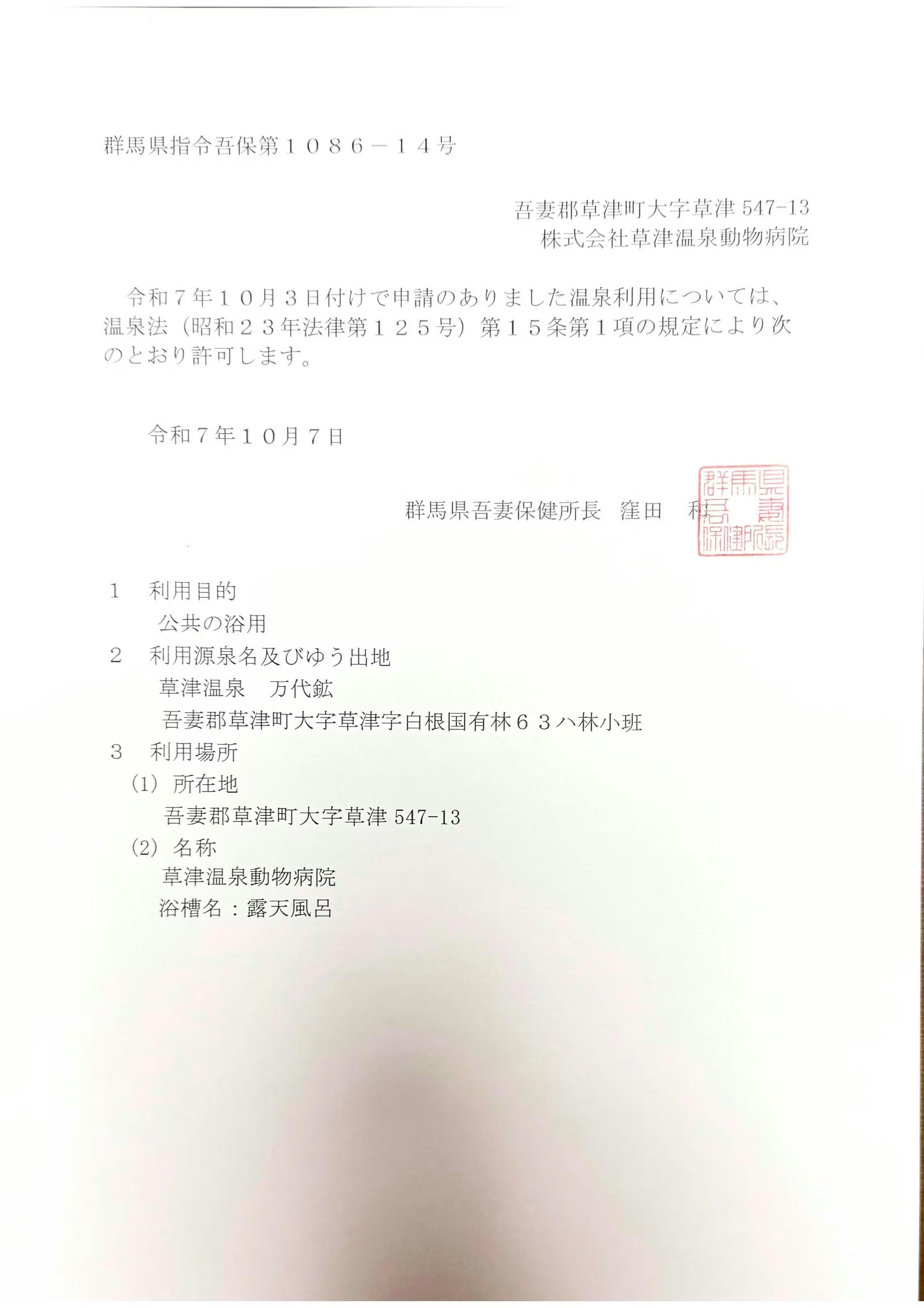 よって「現存し、Web上で公にサービス内容と許認可を確認できる施設」の中において、草津温泉の源泉100%を活用し、宿泊滞在まで可能な動物病院は、本プロジェクトが日本初の事例であると判断いたしました。