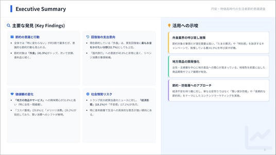 アンケート結果のローデータを送付するだけで、集計・自由回答の整理・示唆の抽出・レポート化までを一気通貫で支援。提案・会議に間に合うスピードで、マーケティングの意思決定を加速します。