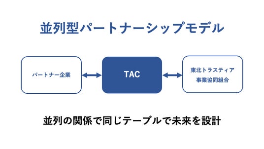 TAC、パートナー企業、ならびに設立予定の東北トラスティア事業協同組合は、いずれも独立した主体として、上下関係や従属関係に依らない「並列型パートナーシップモデル」を構築します。