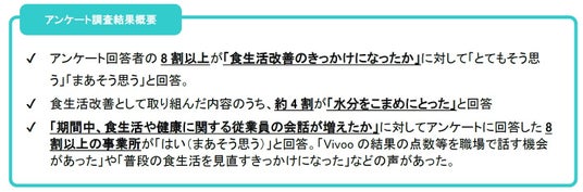 2. アンケート回答に回答した参加事業所の8割以上が「食生活や健康に関する従業員の会話が増えた」と回答。「Vivooの結果の点数等を職場で話す機会があった」や「普段の食生活を見直すきっかけになった」などの声