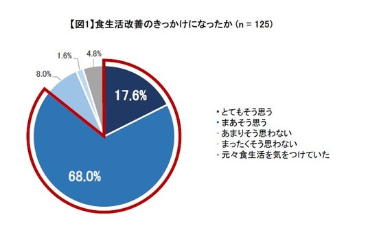 1.アンケート回答者の8割以上が「食生活改善のきっかけになった」と回答。自身の食生活を見直すきっかけとなり、特に水分レベルについては回答者の約4割が「水分をこまめにとった」と回答